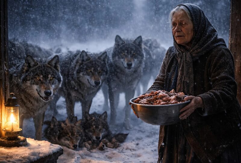 Старушка стояла на крыльце и смотрела, как они едят. Пёс лежал в стороне, живой, лишь прижатый к снегу. Вожак поднял голову и снова посмотрел на неё. В этом взгляде уже не было голода. Там было что-то другое — тихое понимание.